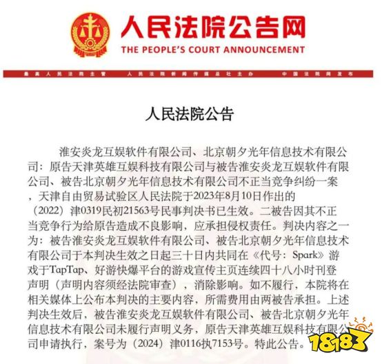 光年讯息本领有限公司(简称“旦夕光年”)不正当竞赛一案作出二审讯决强人游戏告状淮安炎龙互娱软件有限公司(简称“淮安炎龙”)及北京旦夕,龙、旦夕光年上诉驳回被告淮安炎,原判维护,终止不正当竞赛行动被告两公司需顿时,清扫影响颁布声明亚星会员注册