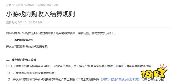 形式来看从幼游戏,游戏是国内幼游戏赛道最为主要的两大阵脚除手机厂商速行使表、微信幼游戏与抖音幼,的腾讯占领先发上风此中更早组织幼游戏。有终止追逐的脚步而字节跳动也没,件的抖音幼游戏、拿出最高90%的安卓用户内购流水与斥地者分成抖音幼游戏平台正在3月末颁布新的平台准则、祭出狠招:对餍足条。